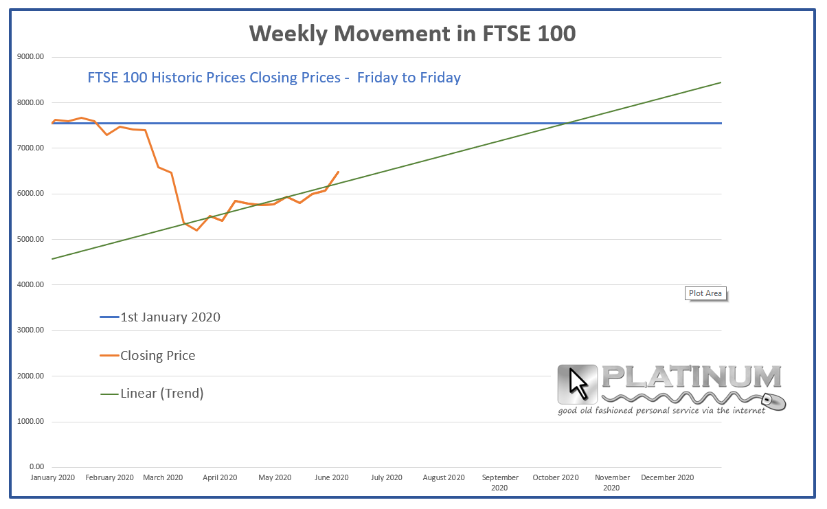 Firstly, we hope this shows that the FTSE 100 may be a good benchmark on which to base your plan. So far there seems to be a good deal of synergy between the FTSE 100 index and how the corona virus has impacted on the UK. The darkest days of March are also reflected in the FTSE 100 performance. The early days of panic have gone to be replaced by stoic acceptance. Slowly as optimism has grown in the UK and the lockdown has been relaxed, then the value of the index has started to increase.